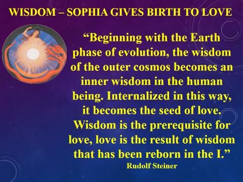 Rudolf Steiner points out, like the Bible, that Sophia (Wisdom) is the most necessary aspect of spiritual development that humanity currently needs to evolve and complete the quest for the Holy Grail – the heart as the throne of Sophia. Sophia brings to all seekers the direct knowledge of the cosmic nature of Christ’s mission. As Steiner put it: “What is needed in our time is the Wisdom (Sophia) of Christ, the knowledge of the cosmic nature of Christ.” Sophia teaches us, as a personal guide, to understand the cosmic mission of Christ’s redemption of the Earth and all of humanity. Without a Christian Cosmology, Jesus Christ cannot be understood by modern materialistic humanity. Only when Wisdom is sought out by the ever-seeking soul to find the path to the higher self, the Christened self, will the individual soul attain to the spiritual marriage of the Ever-Virgin Soul to the Christ realized Spirit.